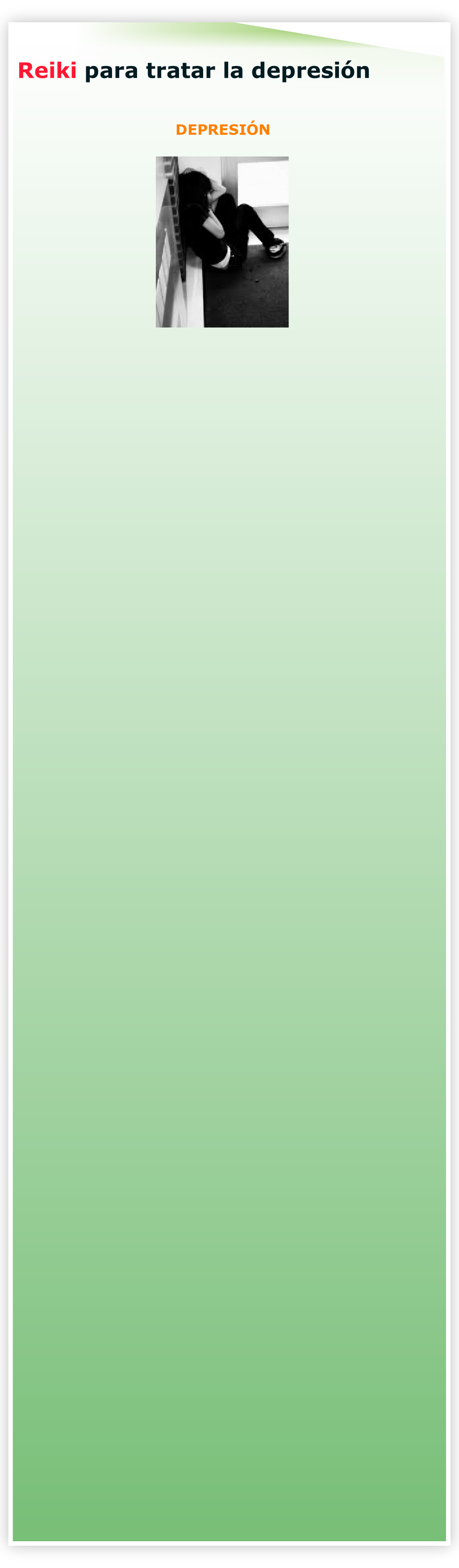 Una persona deprimida se siente cansada, baja en energías, sin ganas de afrontar el mundo. Reiki canaliza la energía que nos rodea hacia el paciente, aumentando su fuerza personal y sus ganas de vivir y seguir luchando. Al mismo tiempo nos equilibra, permitiéndonos visualizar nuestros problemas en un marco mas realista.